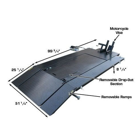 The HI-RISE 1500 offers an extra-tall lifting height of 43 inches, allowing technicians or hobbyists to comfortably work while standing. It comes standard with a chopper extension, extending the center table to 100¾ inches, making it ideal for accommodating longer motorcycles. The side extension kit expands the table width to 51⅛ inches, providing a stable platform for ATVs, UTVs, golf carts, lawnmowers, and other four-wheel vehicles.