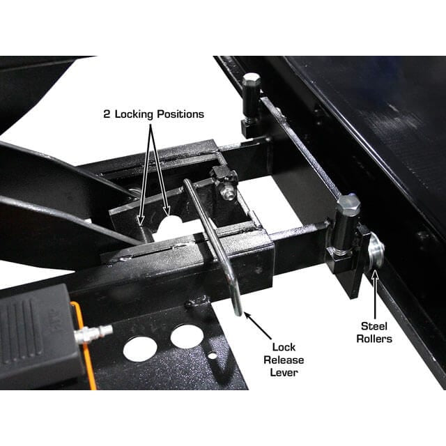 This model includes expandable rail supports, allowing it to fit a wide range of four-post above-ground lifts. Its smooth-rolling design enables the jack to glide effortlessly beneath the entire vehicle length, ensuring easy positioning and operation.