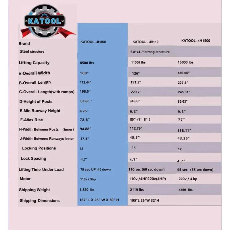 The Katool KT-4H850 8,500 lbs Heavy Duty 4-Post Car Lift is your dependable solution for robust lifting, offering an impressive 8,500 lbs lifting capacity. This CE-approved and certified lift meets 115% dynamic loading capacity standards and passes rigorous 150% static loading capacity tests, ensuring top-tier performance and safety for your garage or workshop.