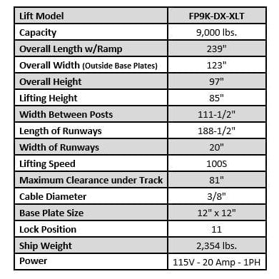 The FP9K-DX-XLT Four Post Lift is designed and constructed to be a commercial grade lift, with industry leading Runway length & Drive-Thru width, allowing the ability to either Store or Service large vehicles. In addition, the FP9K-DX-XLT comes standard with Poly Casters, Drip Trays & Jack / ToolTray, making it one of the best lift values in the industry!